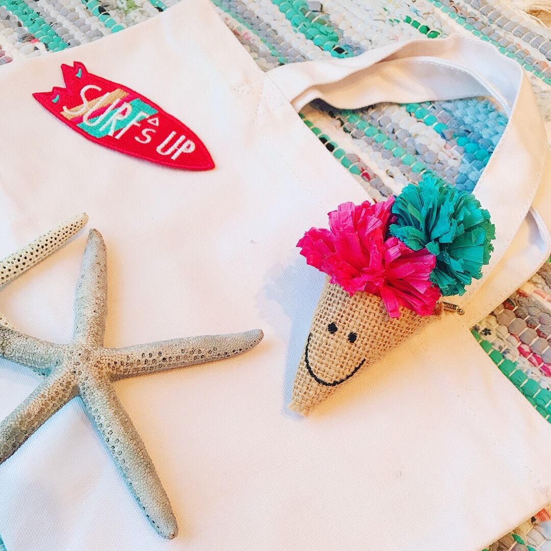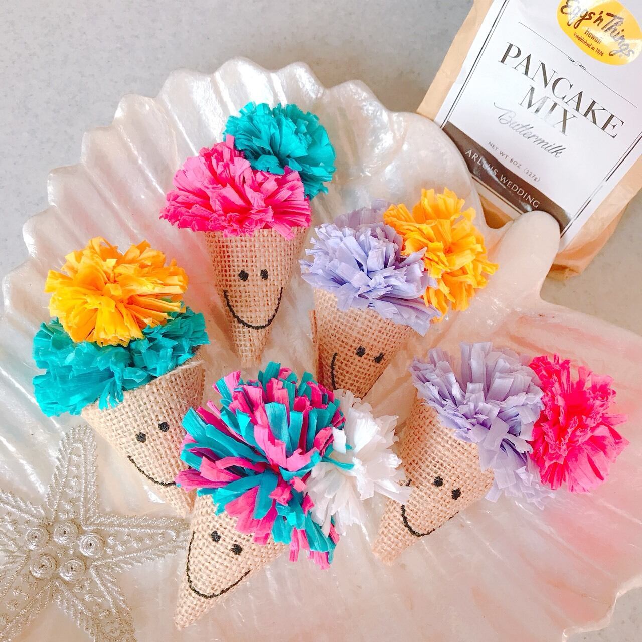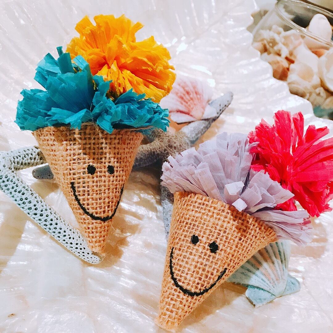 様々なカラーの組み合わせのアイスキーチェーンになります。コーンにはジュート生地にニコちゃんが刺繍してあります。