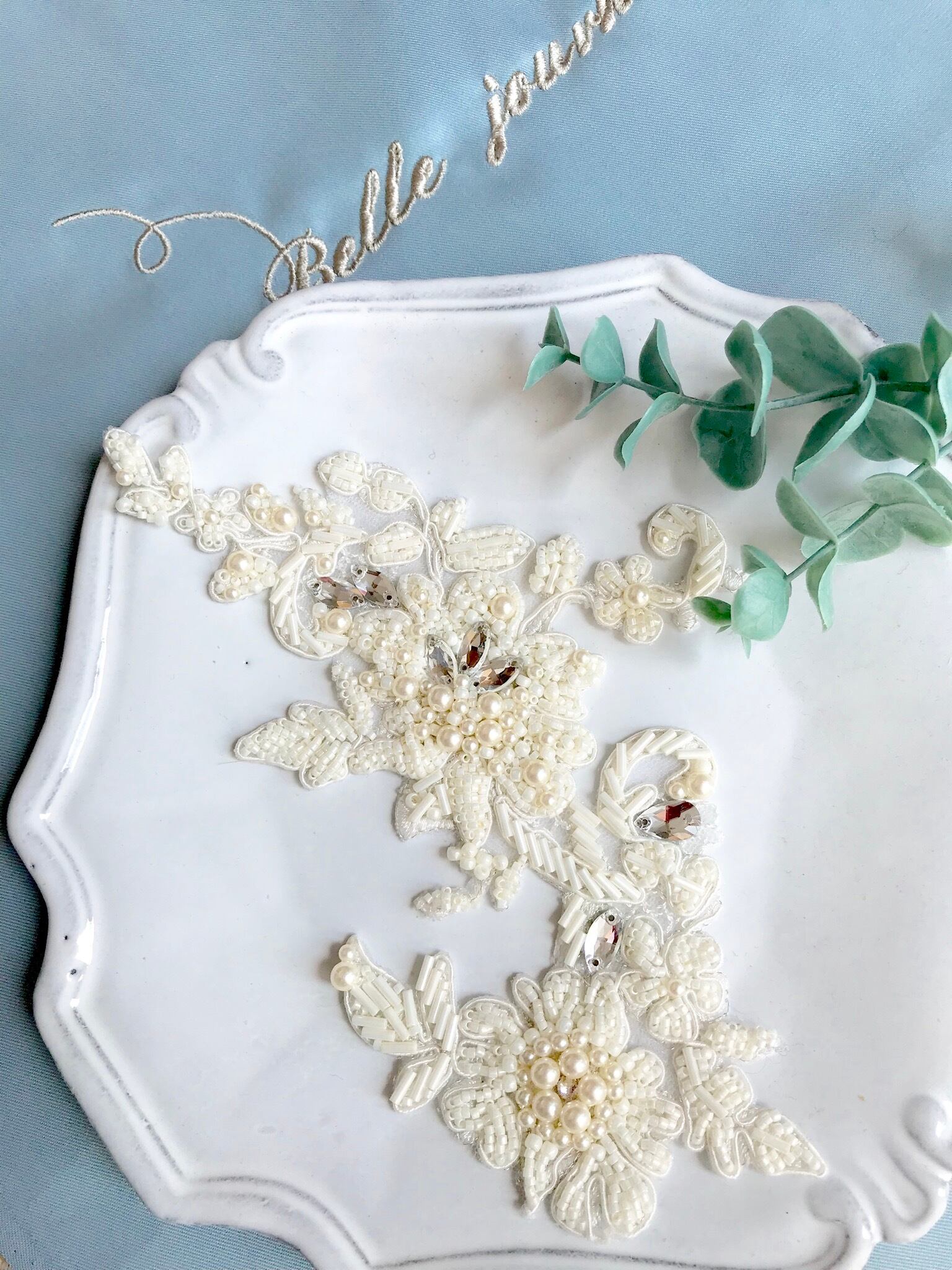 こちらはレースモチーフのオーダーのヘッドアクセサリーで、一つ一つビーズを縫い付けております。アクセントなパールやスワロフスキーも組み込みデザインしております。もちろん写真のデザインそのままご購入いただくこともできますが、追加デザイン等もできますのでご相談ください。