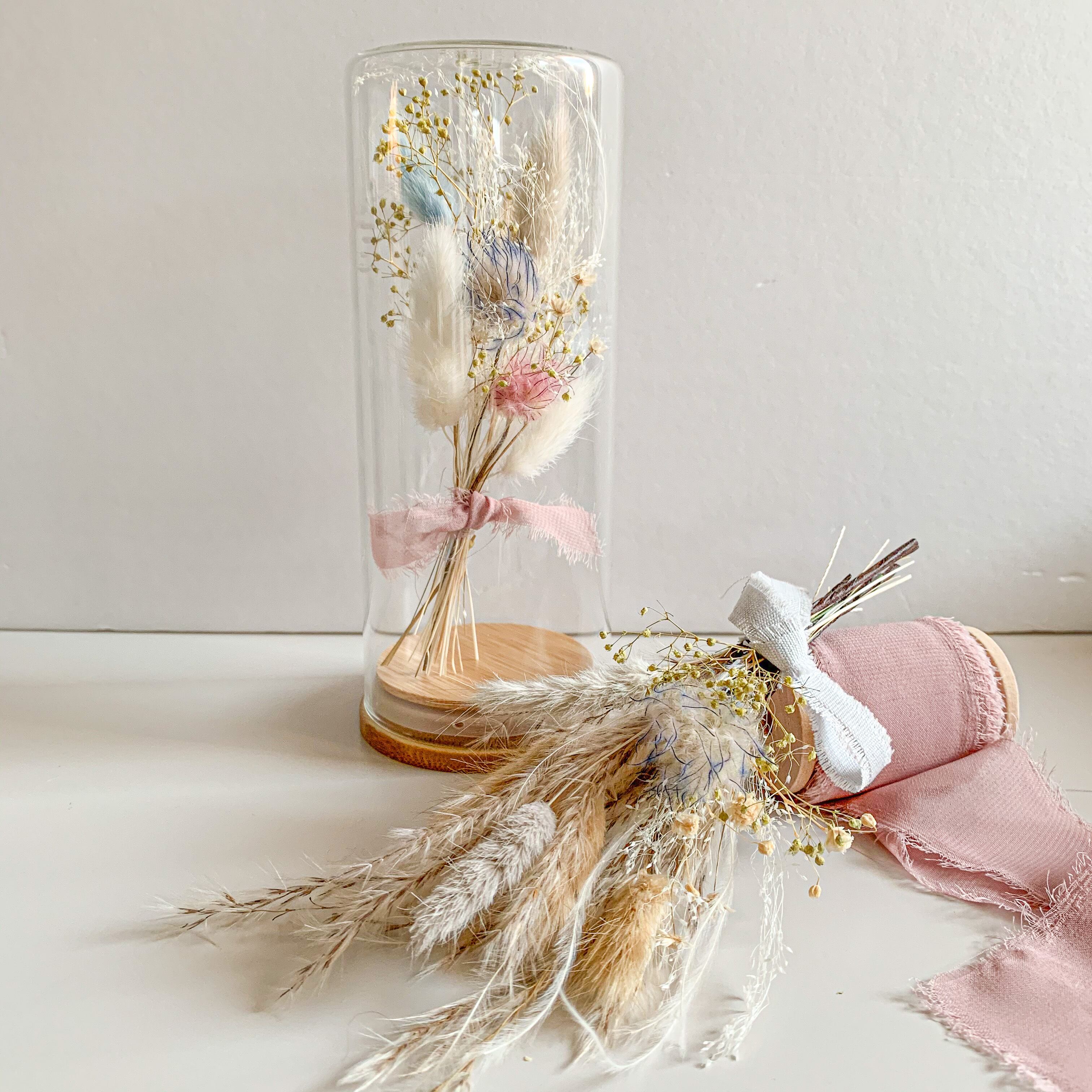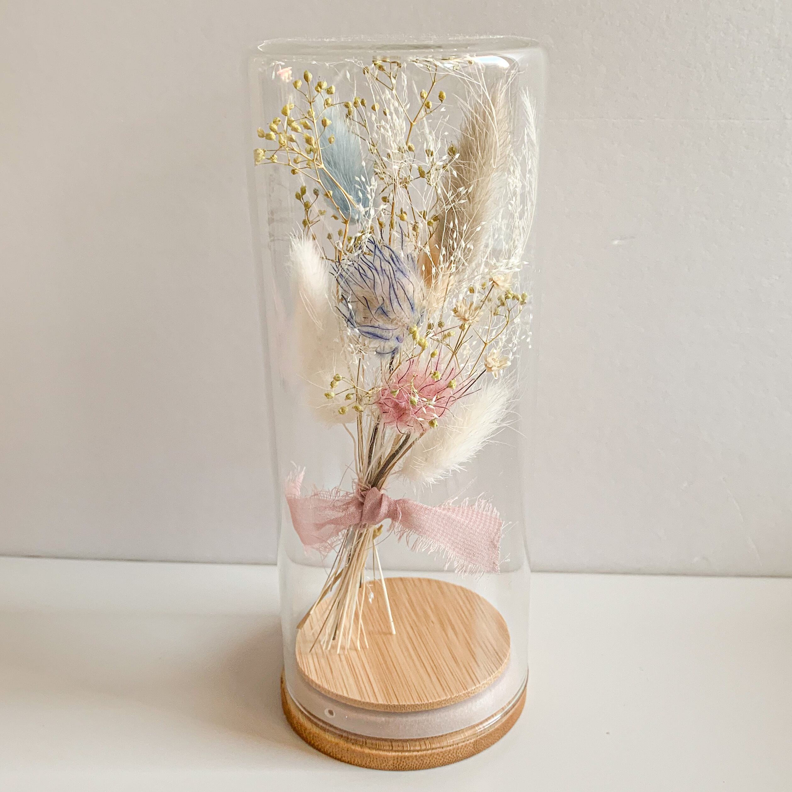ドライフラワーのミニブーケをガラスキャニスターに封じ込めたインテリアです。