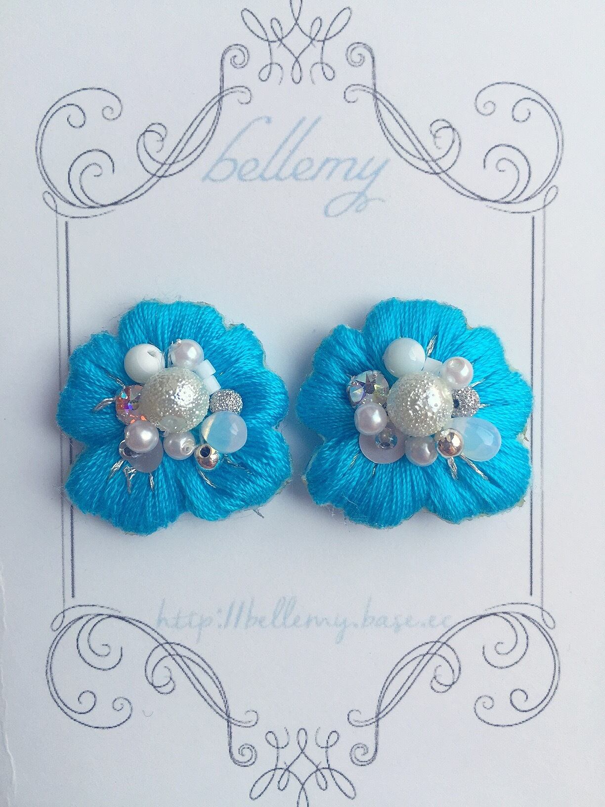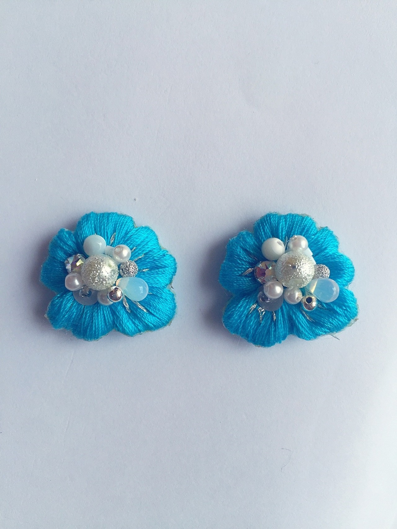 ターコイズブルーの糸のお花型刺繍の上に、
