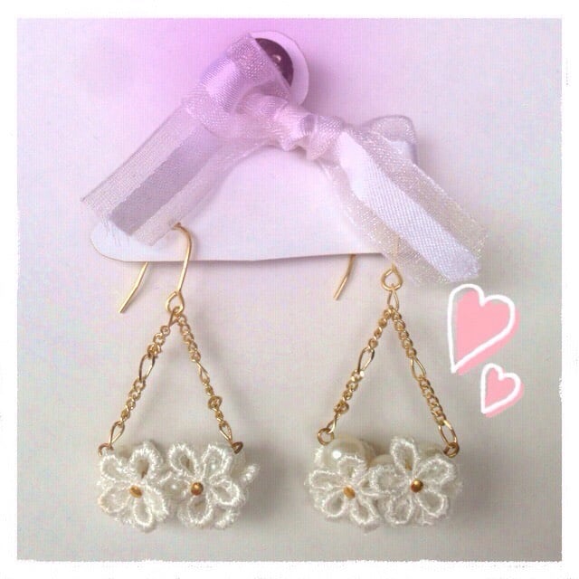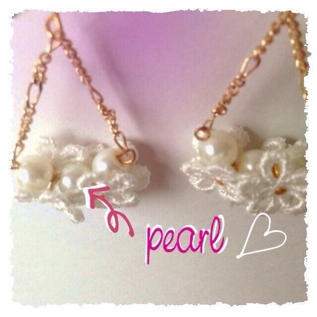 白色の花型レースとパールのピアスになります。