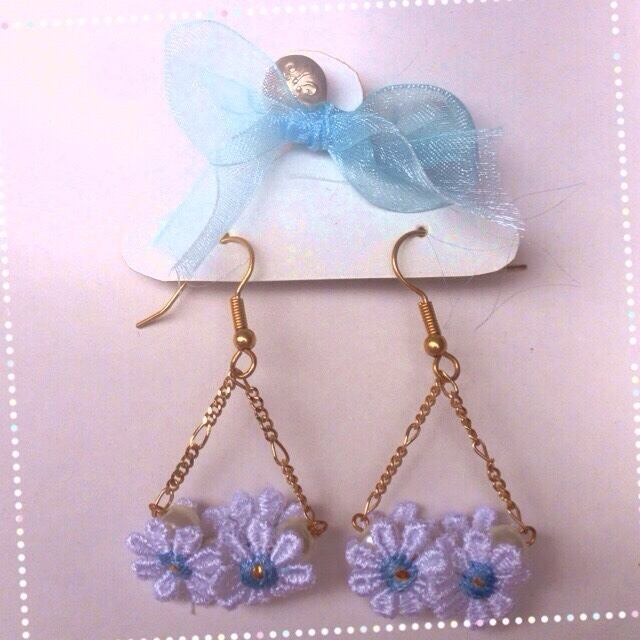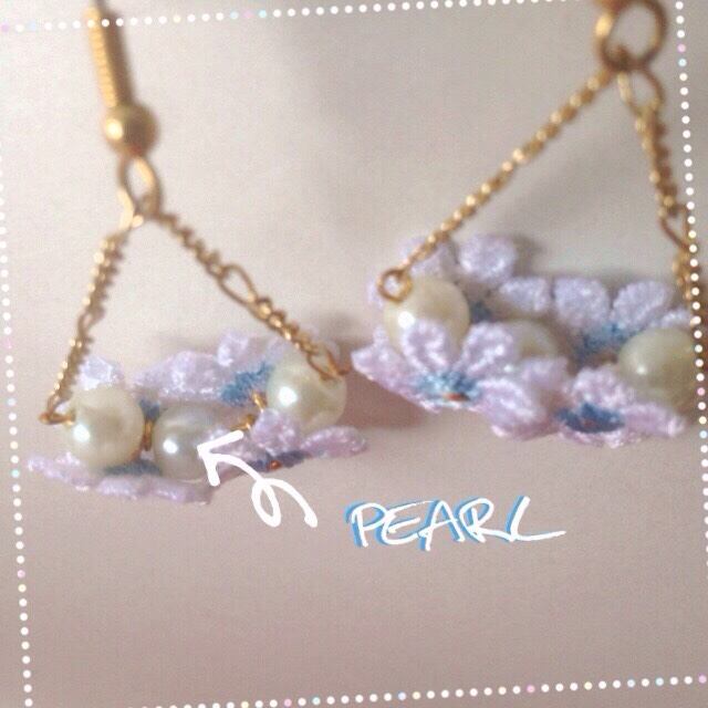 水色の花型レースとパールのピアスになります。 ちらっと見えるパールがとてもかわいらしい一品です。