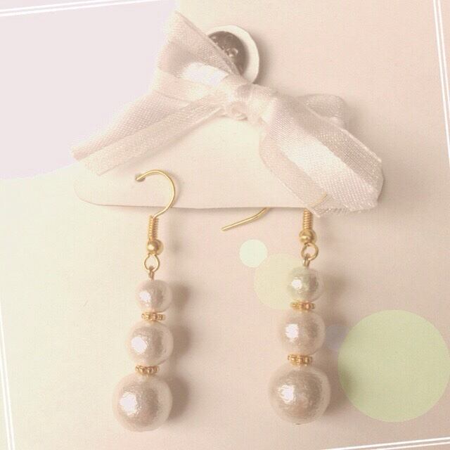 コットンパールの間にゴールドのパーツを挟んでいるので、揺れた瞬間にちらりと見えるゴールドが大人らしい表情を見せてくれます。