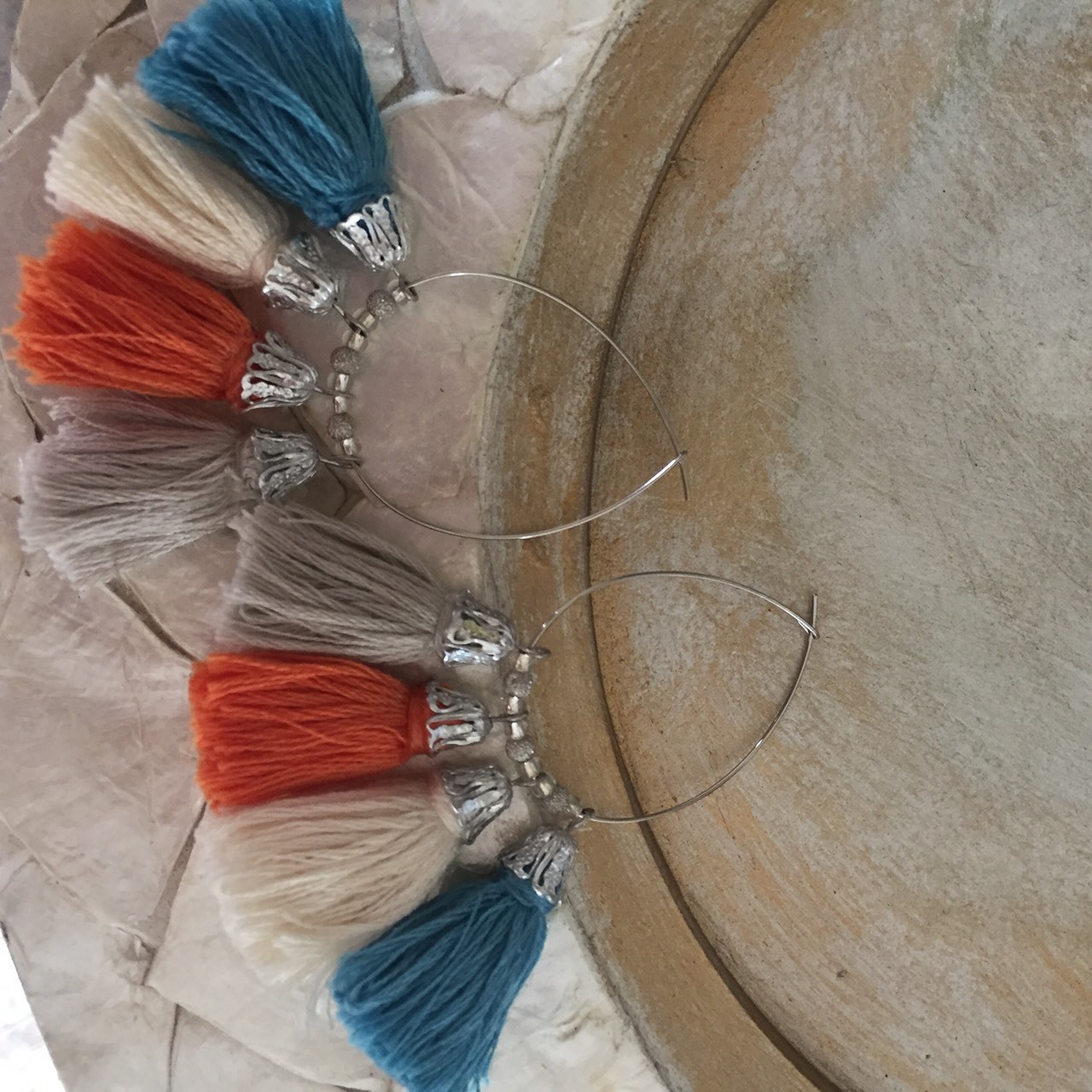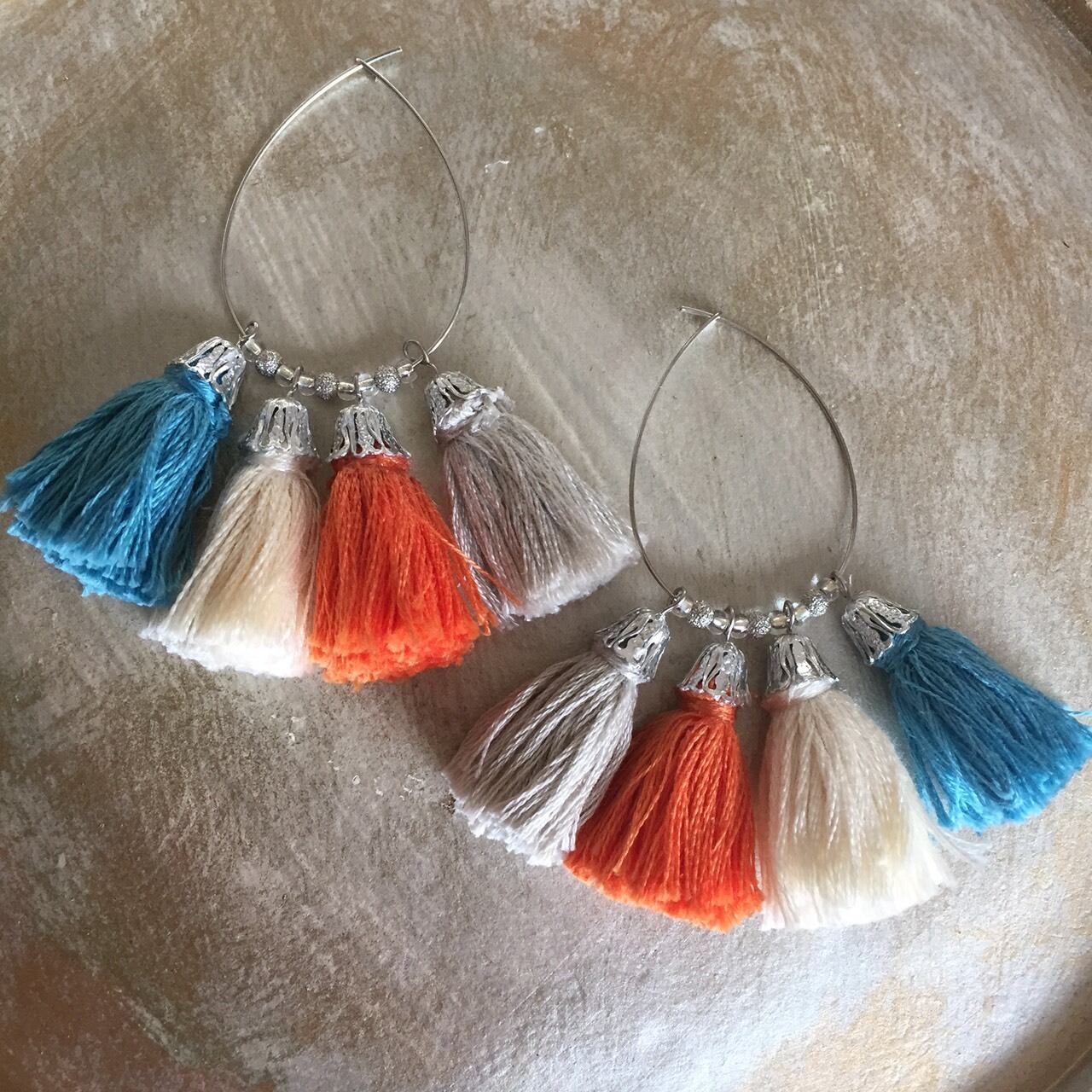 ターコイズブルー×オフホワイト×少しくすみのあるオレンジの4色のタッセルピアスです。