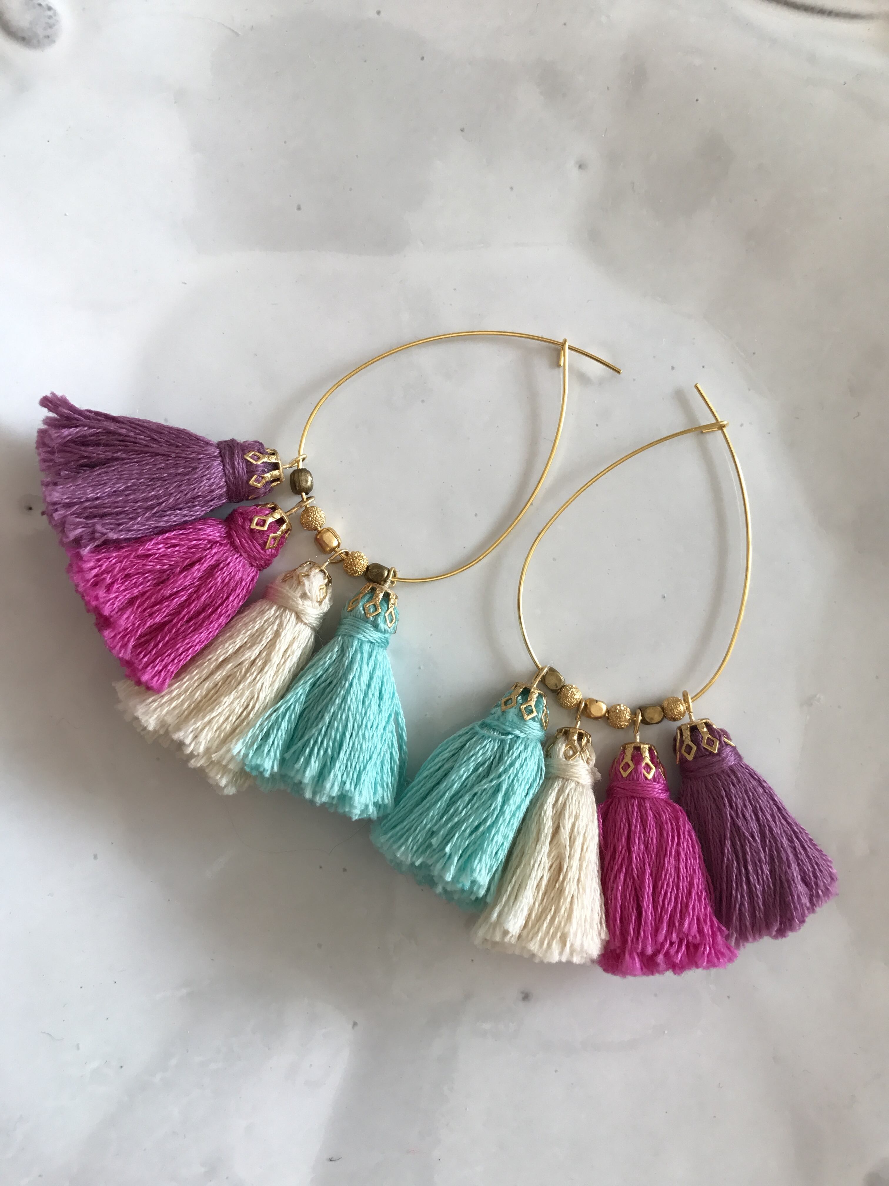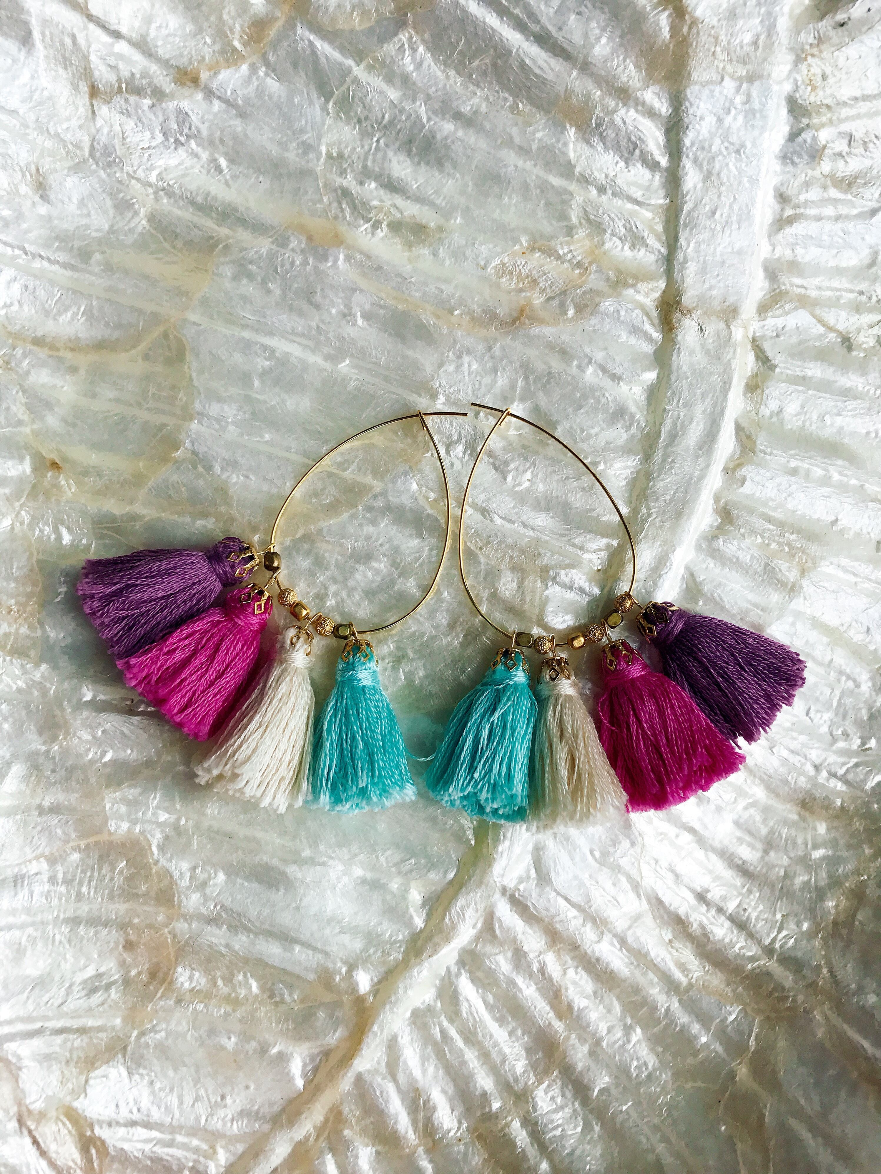 ピンク、パープル、ブルー、オフホワイトの4色タッセルピアスになります。