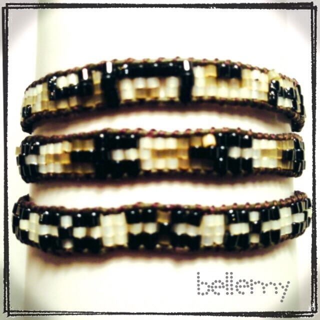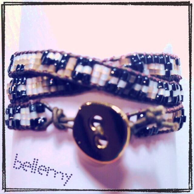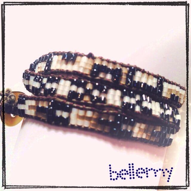 紺色とベージュとホワイトのガラスビーズを一粒一粒編みこみました。
