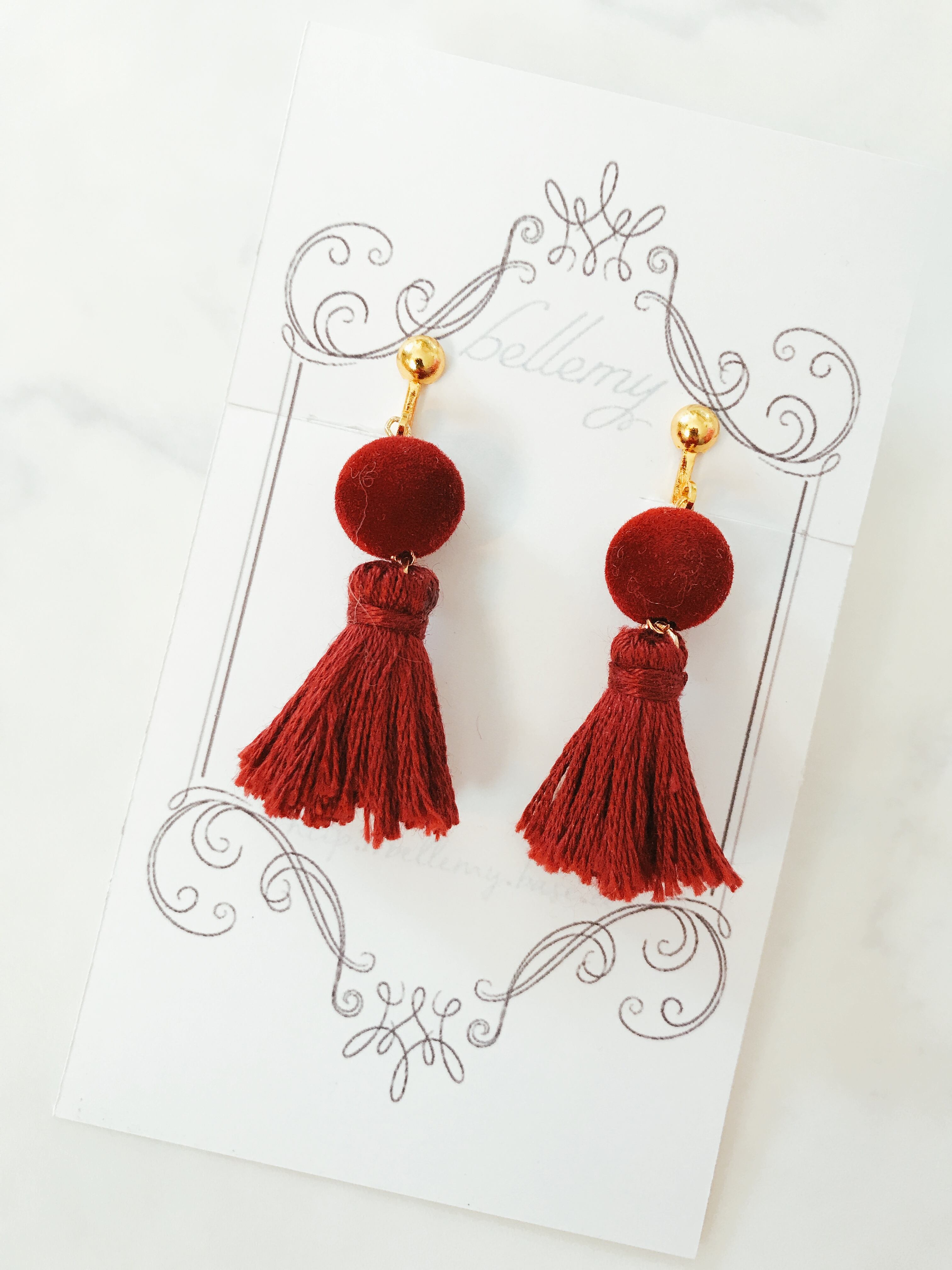 ボルドーのフロッキービーズにミニタッセルをつけたアクセサリーです。